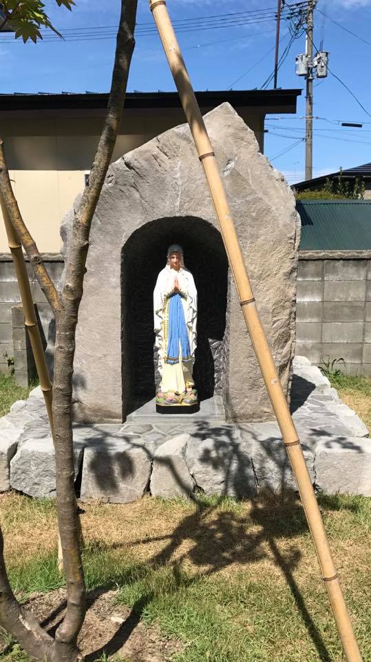2017年8月11日 土崎カトリックこども園にルルドのマリア様が設置されました 土崎カトリックこども園の中庭に、ルルドのマリア様が設置されました。男鹿から運んで来た岩の中から、優しく園児たちを見守ってくれることでしょう。13日に飯野神父様が祝別されます。 まだ設置されたばかりですが、秋頃には薔薇の花や樹木も植えられます。ぜひ、巡礼にお出でください。